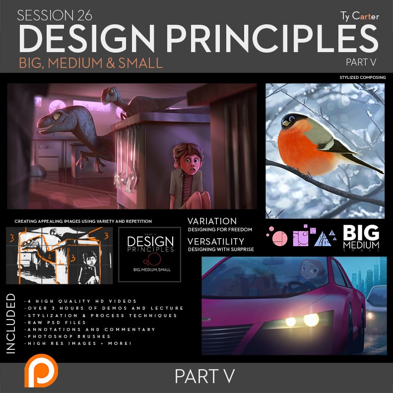 "Big, Medium, Small", the child of principles Repetition and Variety, can improve the appeal of just about any design. This in depth master series dives into a variety of approaches to push your design and taste to a new level. Session 26, Design Principles Part V, is a 4 video session in which I'll explore characters, environments, and worlds. I'll discuss guidelines for coherency as well as art direction techniques to elicit emotional responses to your work based on design decisions.